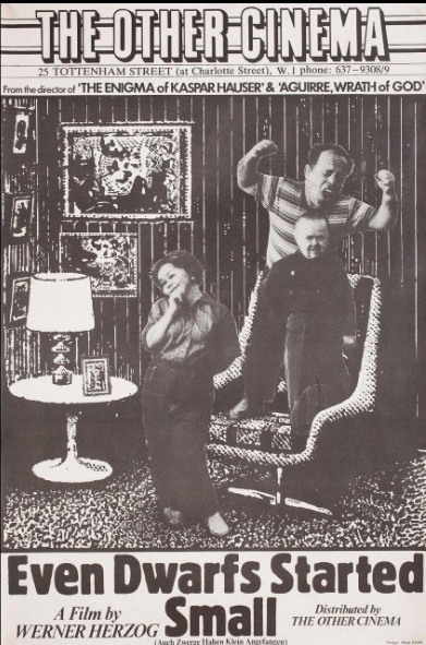 Despite the general sense of unpleasantness, there still manages to be an odd sweetness about the film. I’m specifically thinking of the scene where two dwarf lovers are unable to make love because the man can’t get into the regular-sized bed. This kind of whiplash in tone kind of makes Even Dwarfs Started Small hard to pin down, but it definitely is a unique viewing experience.